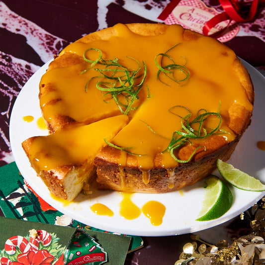 Bake-at-home coconut and lime cheesecake with mango coulis